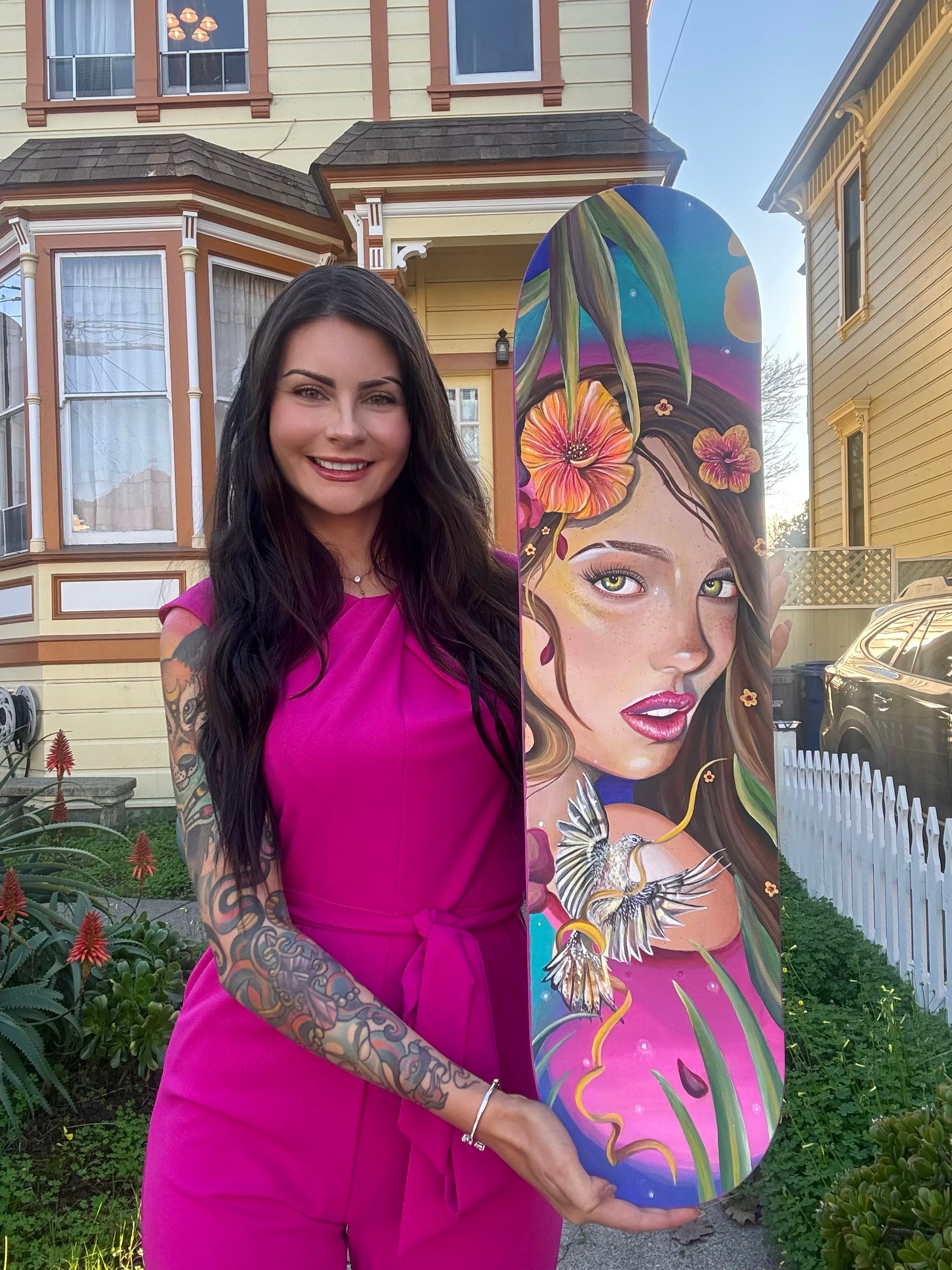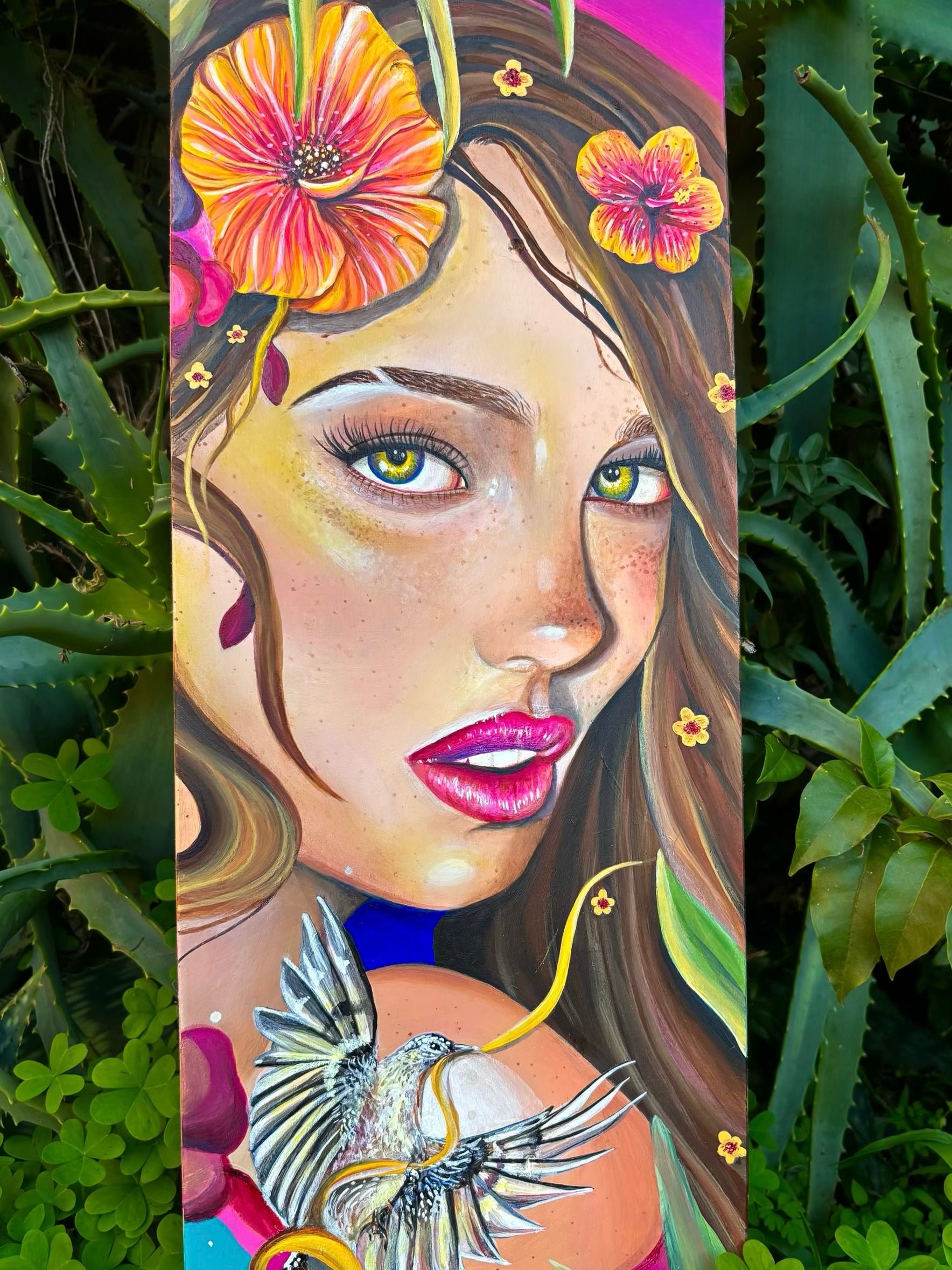Original acrylic painting on a wood skate deck! 💖 Mounted and ready to hang in your home! Dimensions: 31” x 8”.